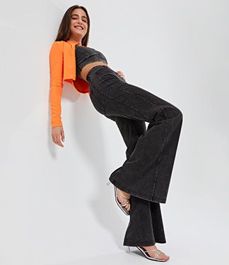 Halara Flex™ ハイウエスト クロスオーバー ポケット ウォッシュ加工 ストレッチニット カジュアル フレア ジーンズ