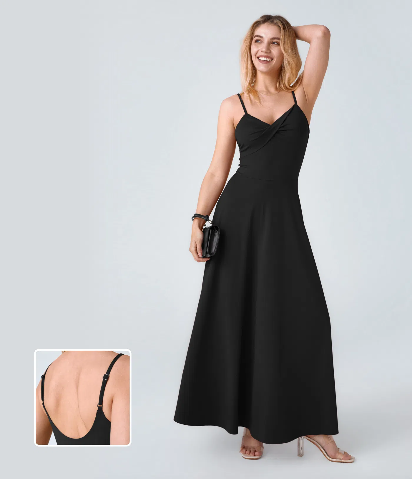 調節可能なストラップ、Uバック、バックレス、ツイストフレア、ゆったりとしたマキシスリップリゾートドレス