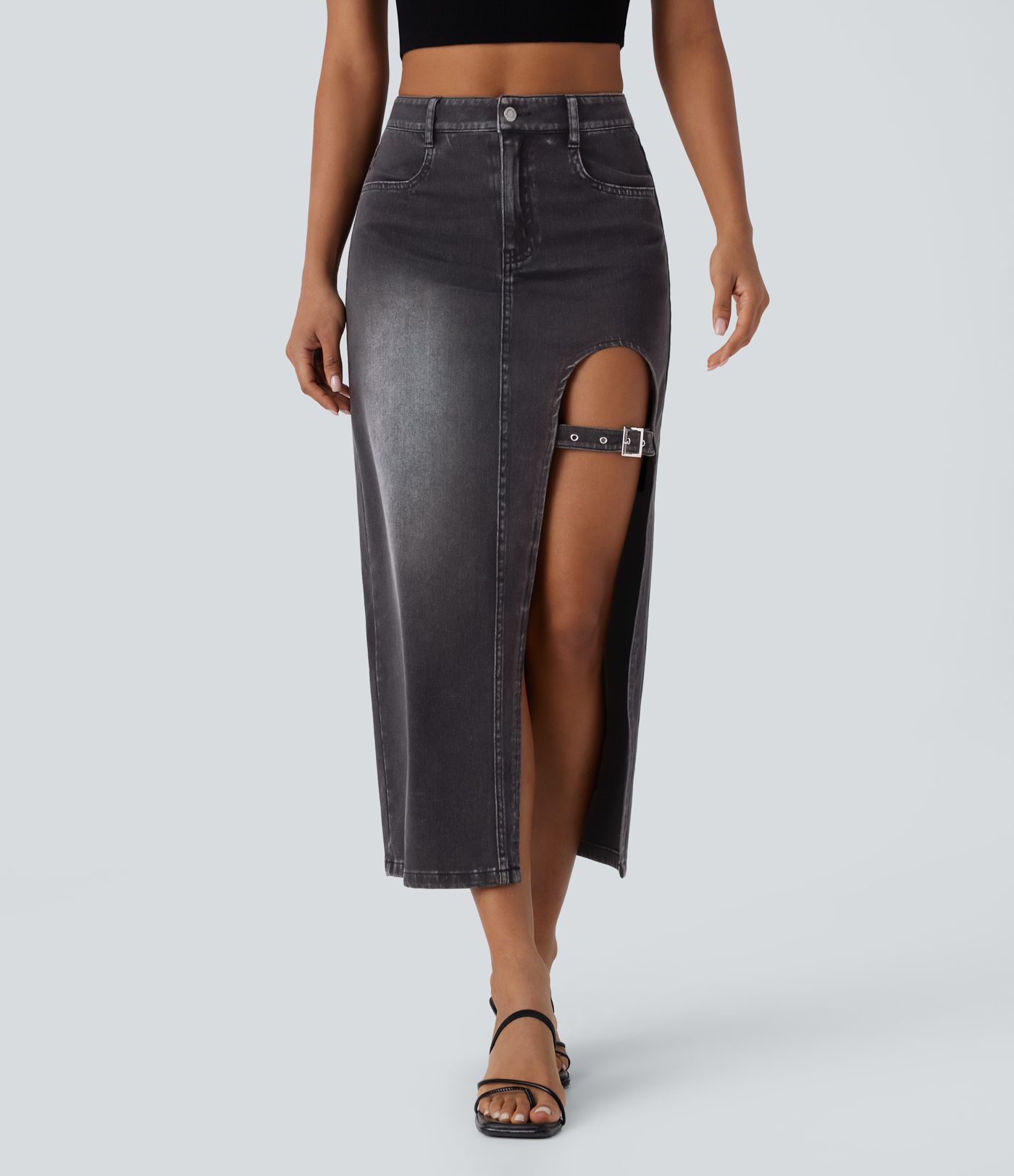 Halara Flex™ Mid Rise Pockets Adjustable Buckle Midi Washed Denim Casual Skirt