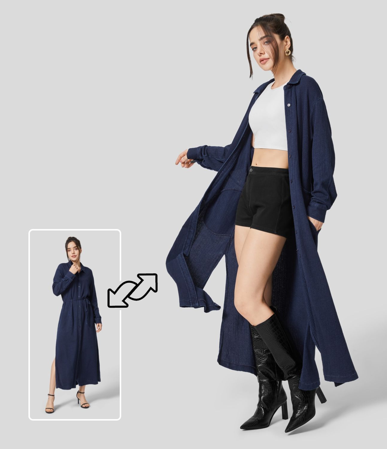 Halara Flex™ Casual, washed shirt dress in elastic knit denim with collar, front button placket, side pockets, and slit hem