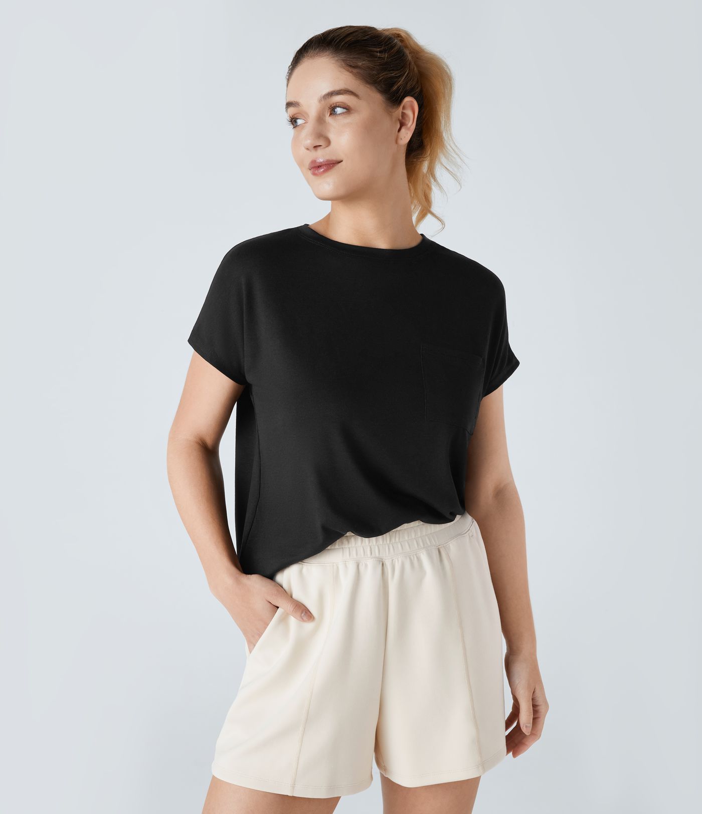 Round Neck Chest Pocket Split Hem Relax Casual T-shirt
