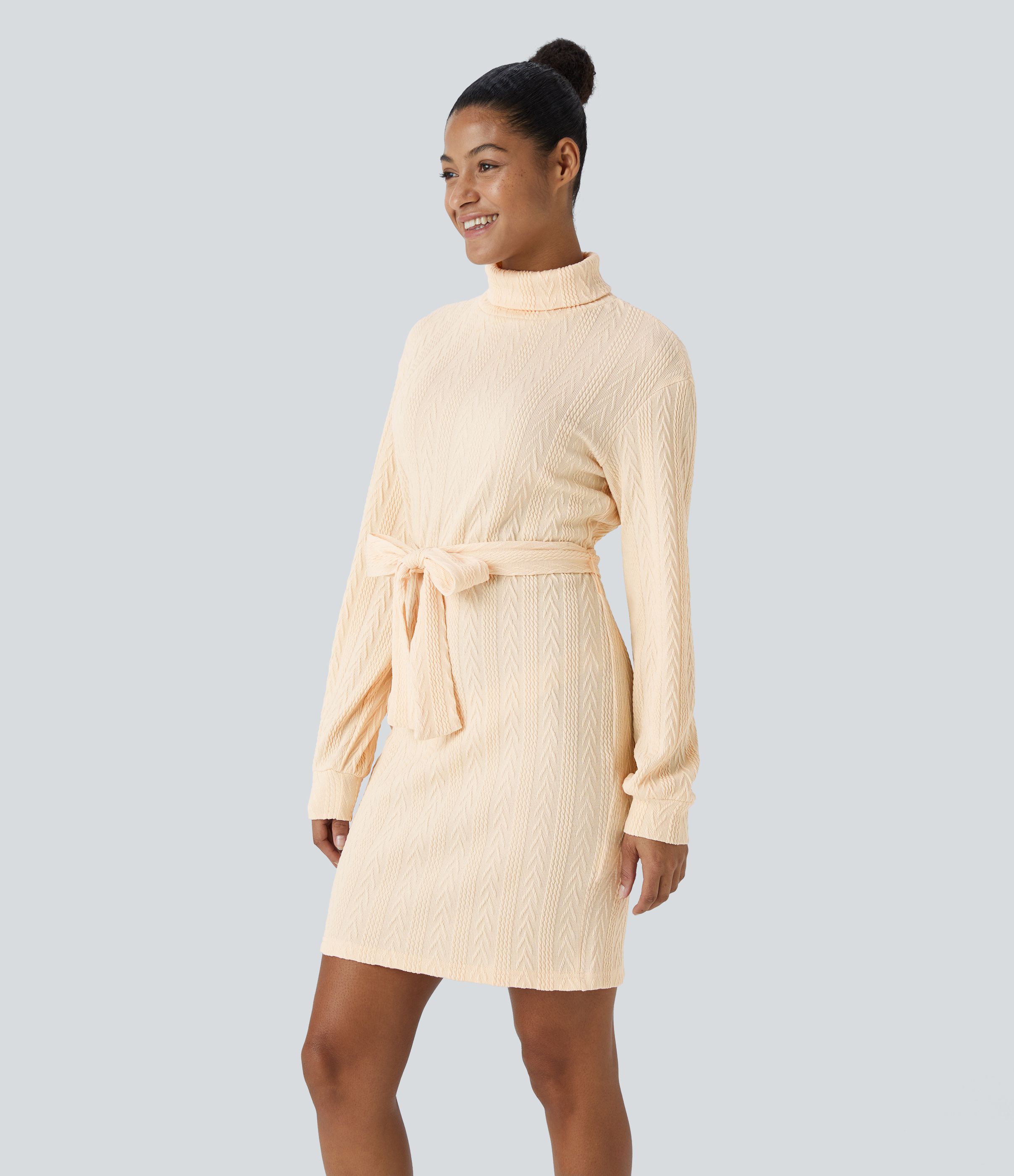 High Neck Long Sleeve Belted Knit Bodycon Mini Casual Dress