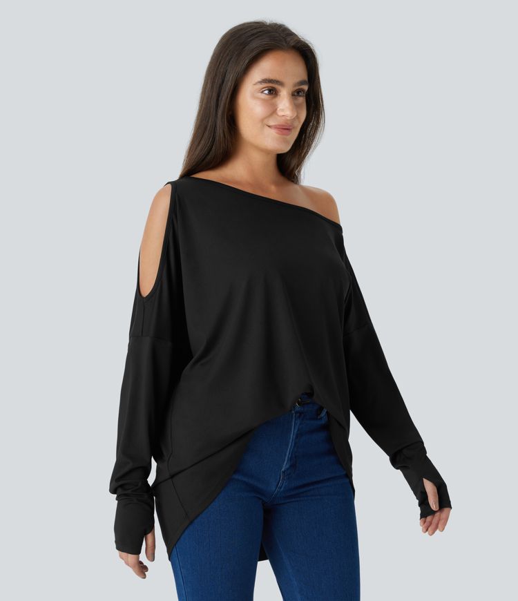 Cut Out Oblique Shoulder Thumb Hole High Low Oversize Casual Top