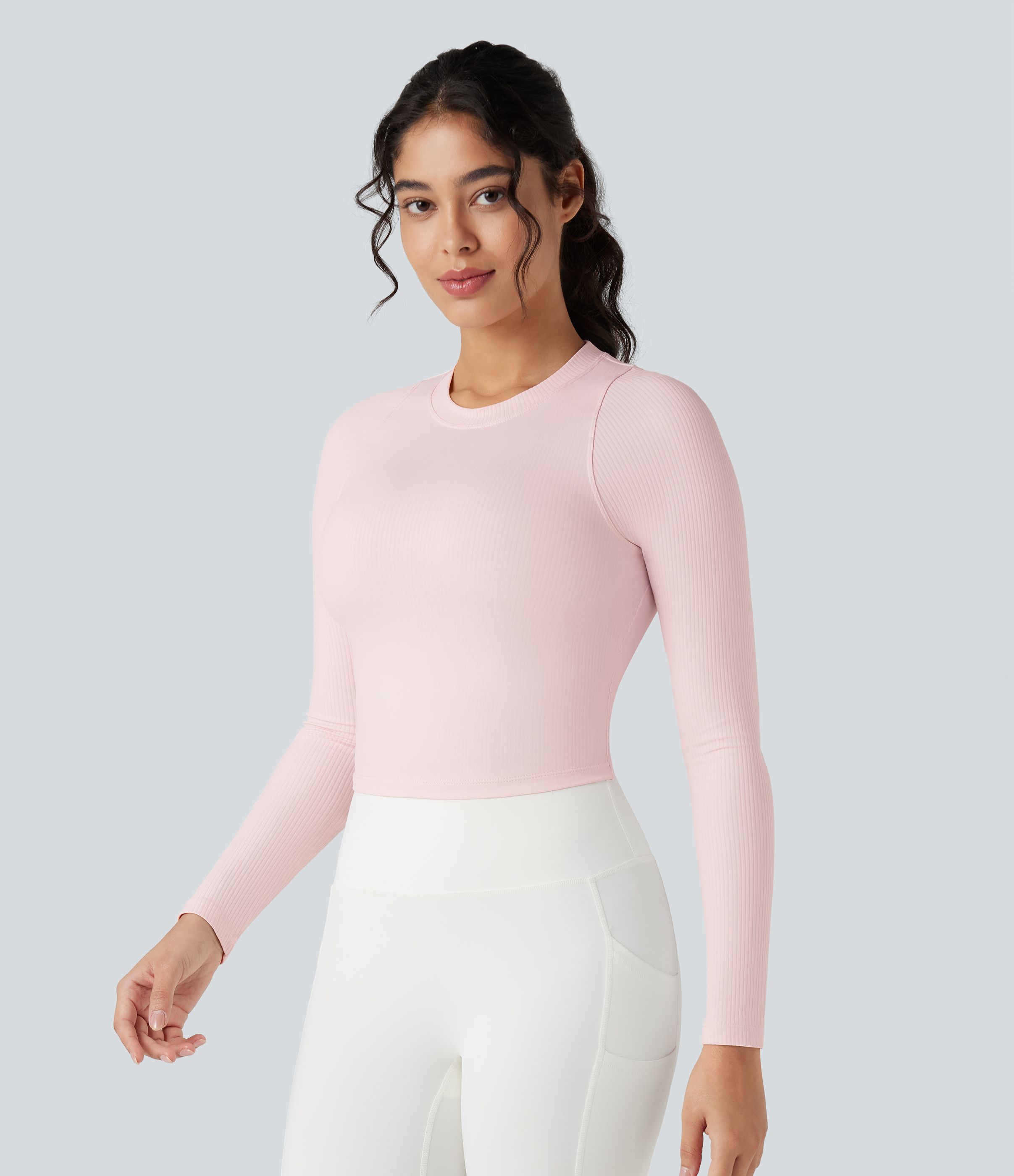 リブニット素材のラウンドネック長袖スリムフィットヨガトップ