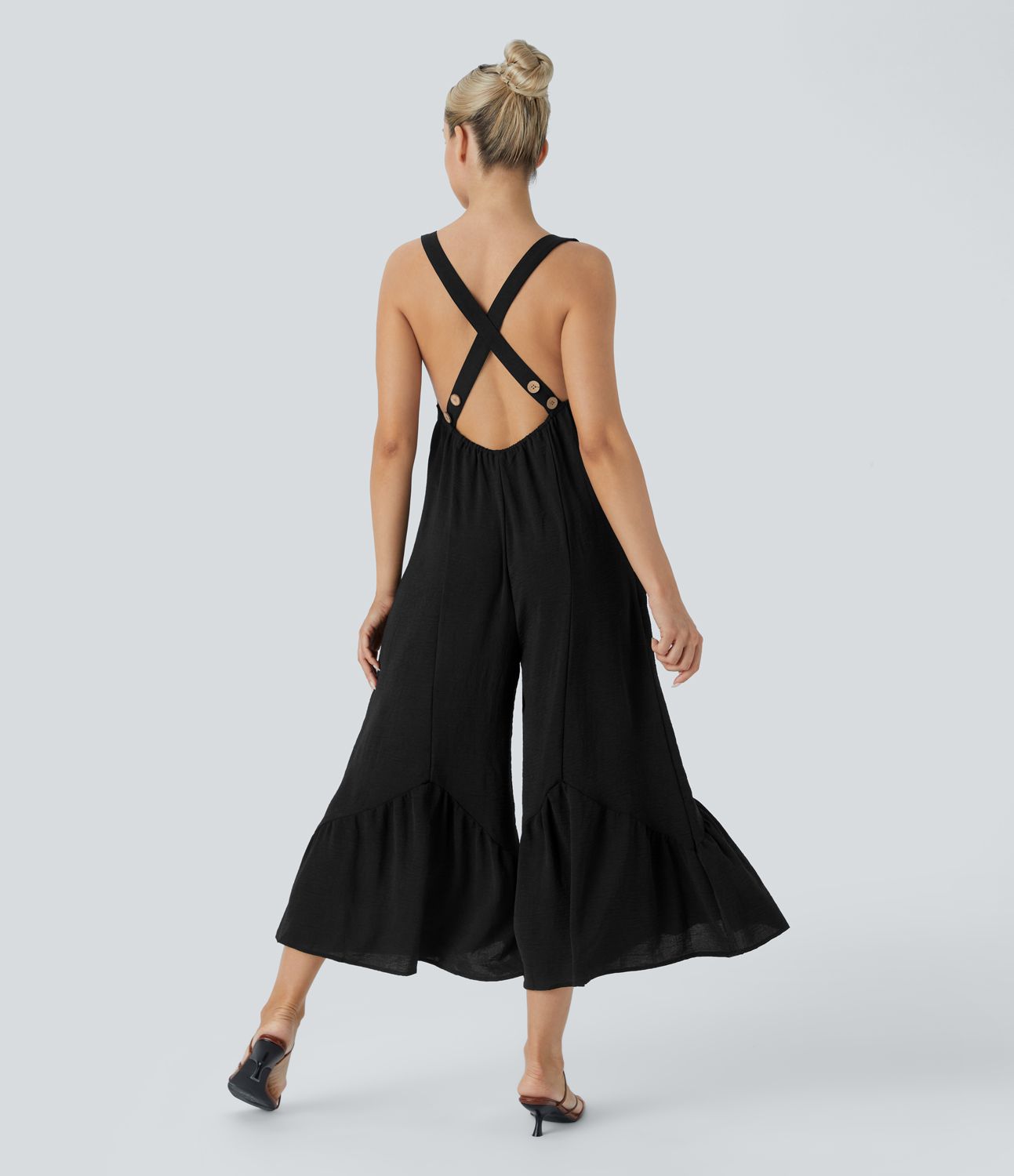Backless Crisscross Adjustable Strap Button Side Pocket Frill Wide Leg Capri Casual Jumpsuit