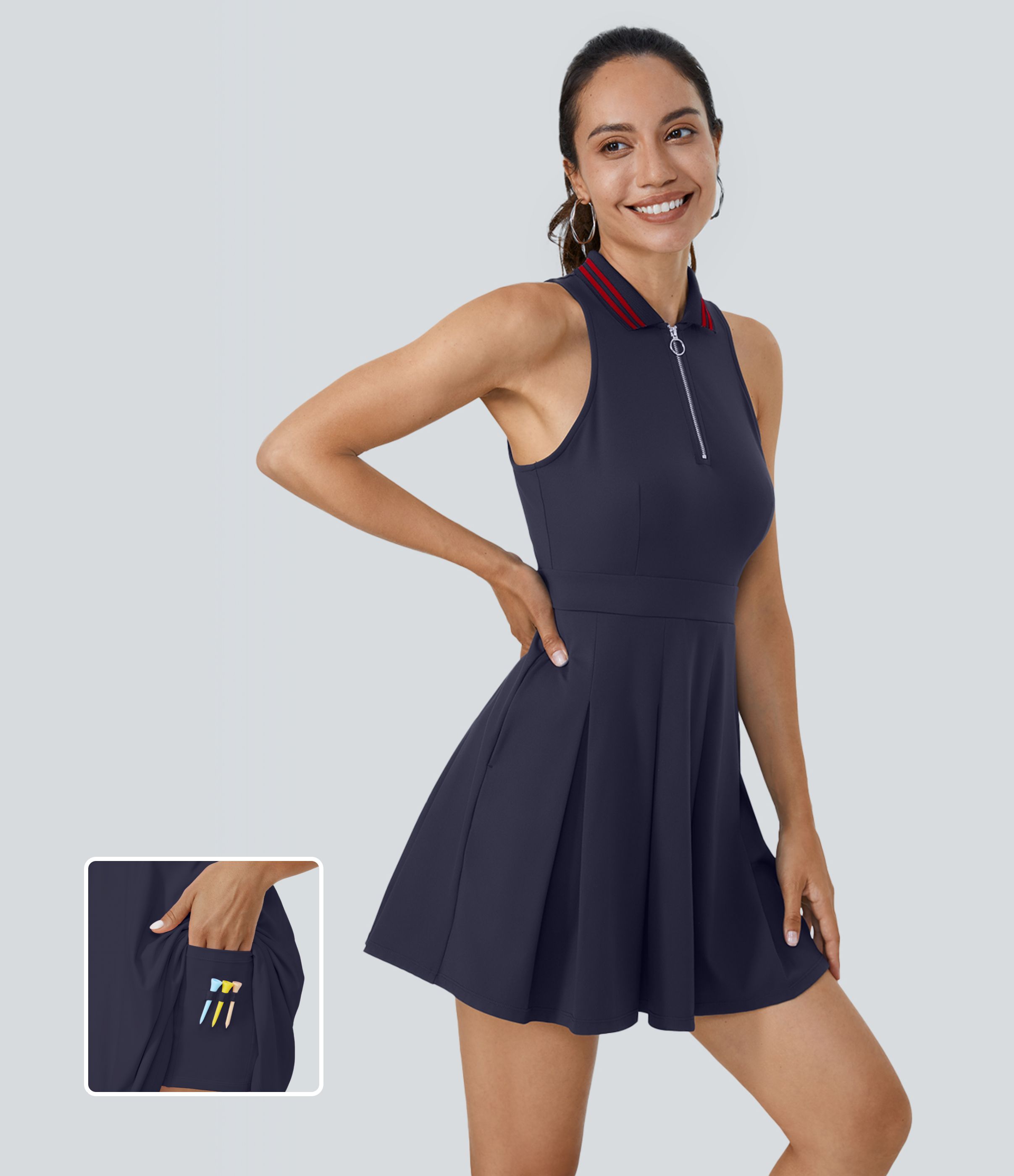 Collar Half Zip 2-Pocket Pleated Golf Active Dress - Golf Tee Pocket