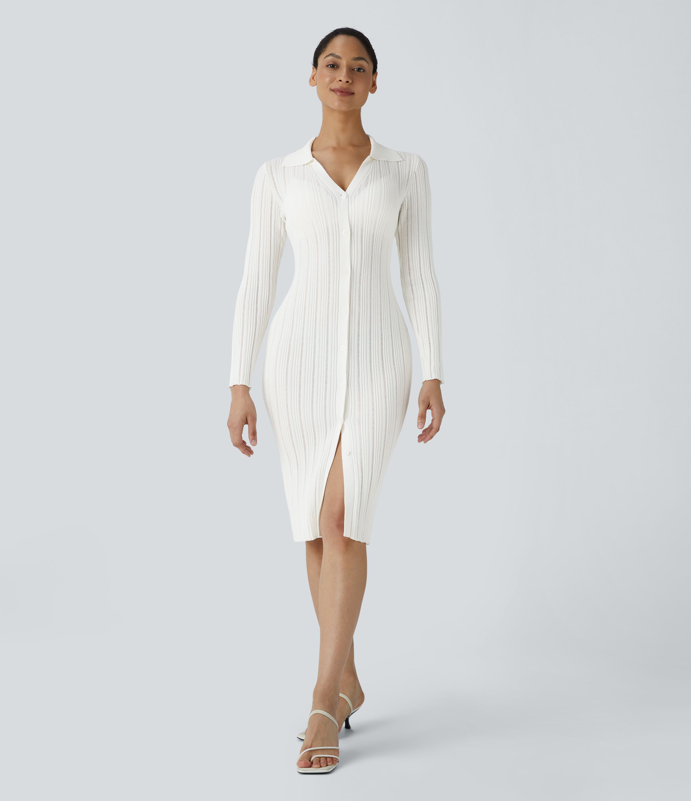Collared Button Long Sleeve Bodycon Midi Casual Sweater Dress