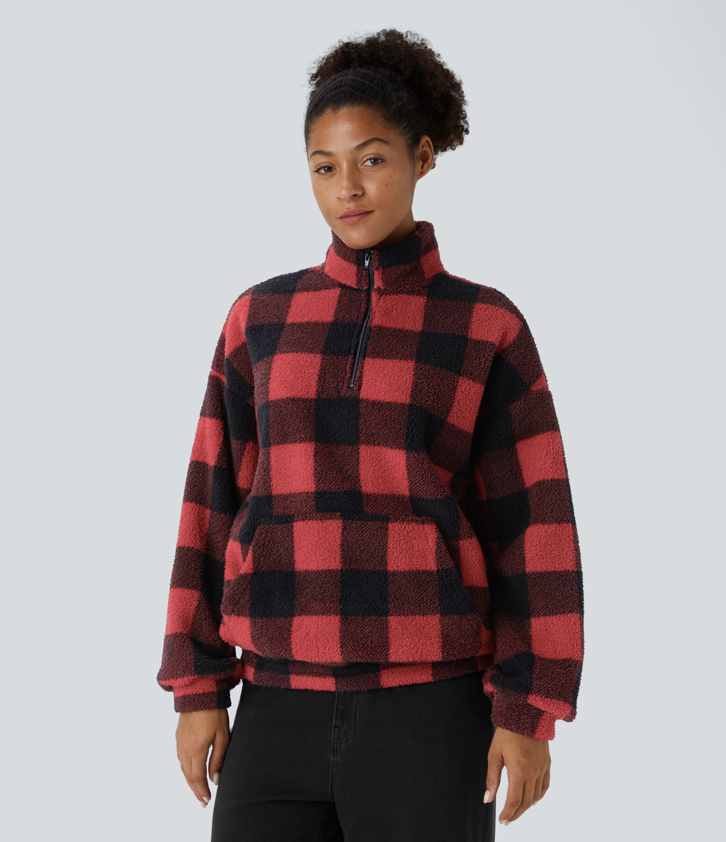 Collared half-zip drop-shoulder kangaroo pocket checkered fleece relaxed casual sweatshirt