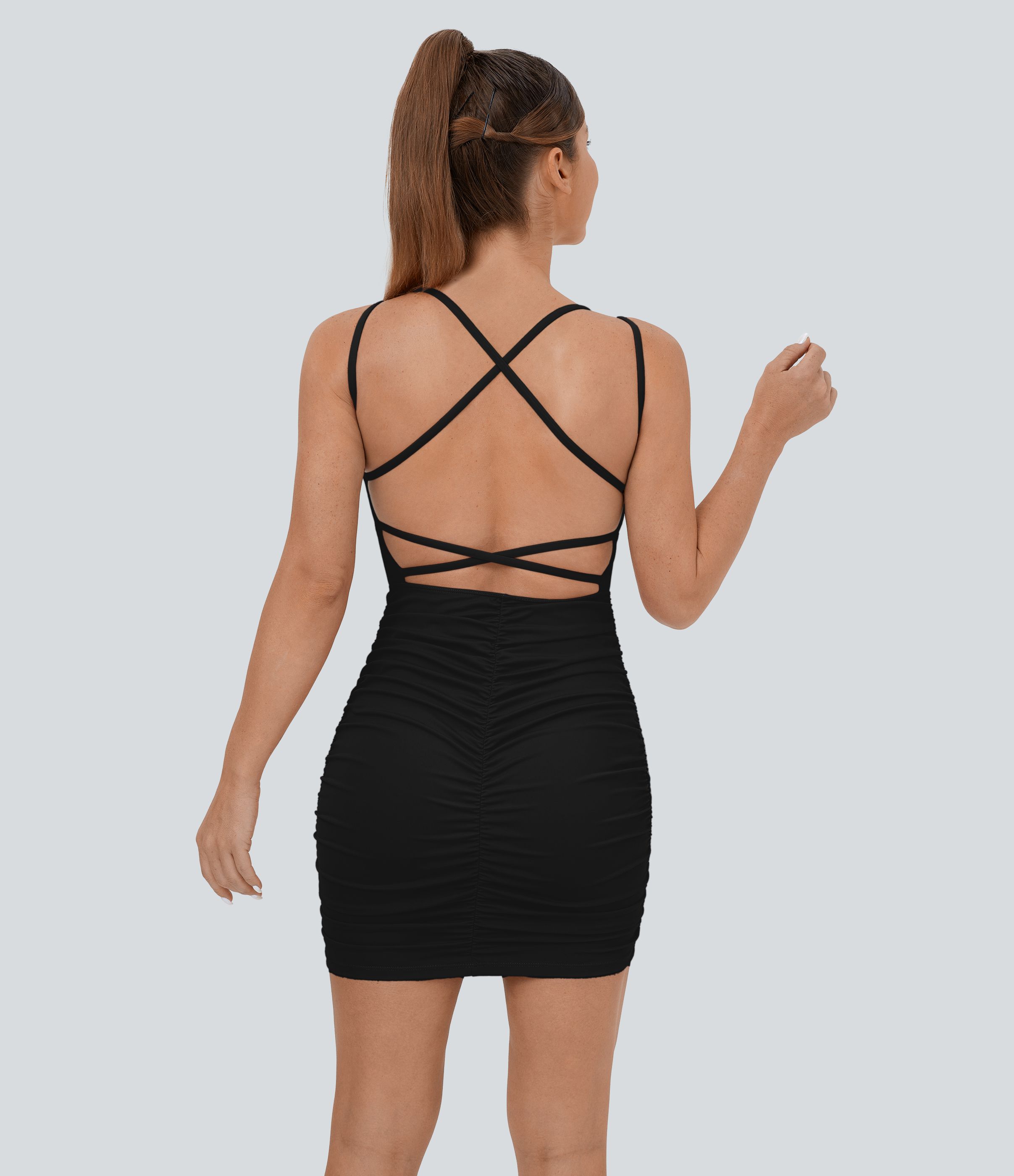 Crisscross Backless Ruched Bodycon Mini Casual Dress