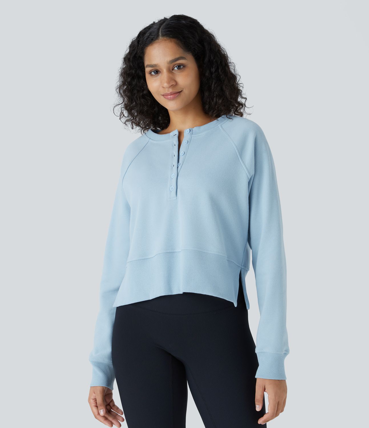 Henry neck button front long sleeve split rib hem casual sweatshirt