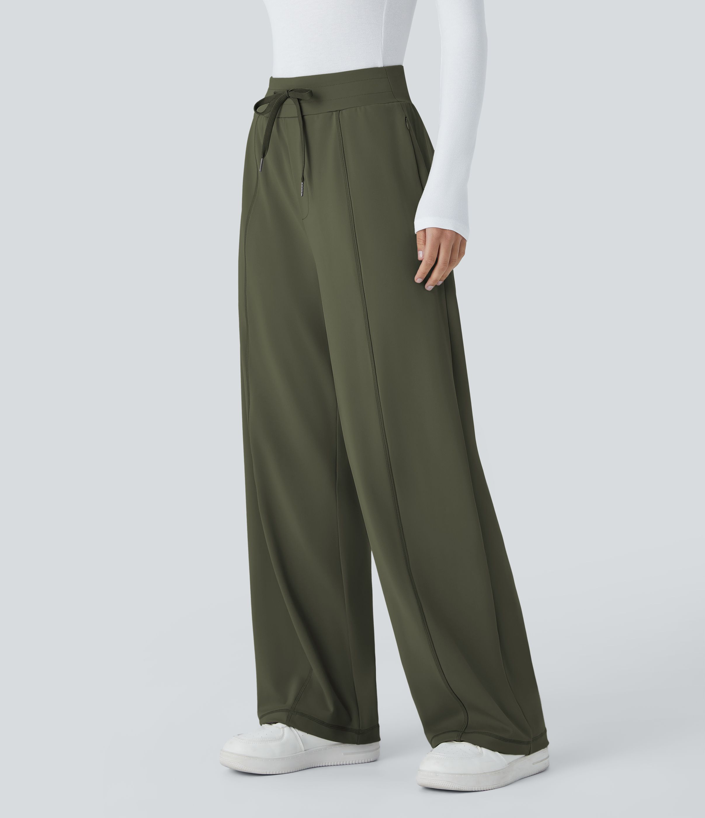 High Waist Drawstring Side Zipper Pocket Straight Leg Casual Pants