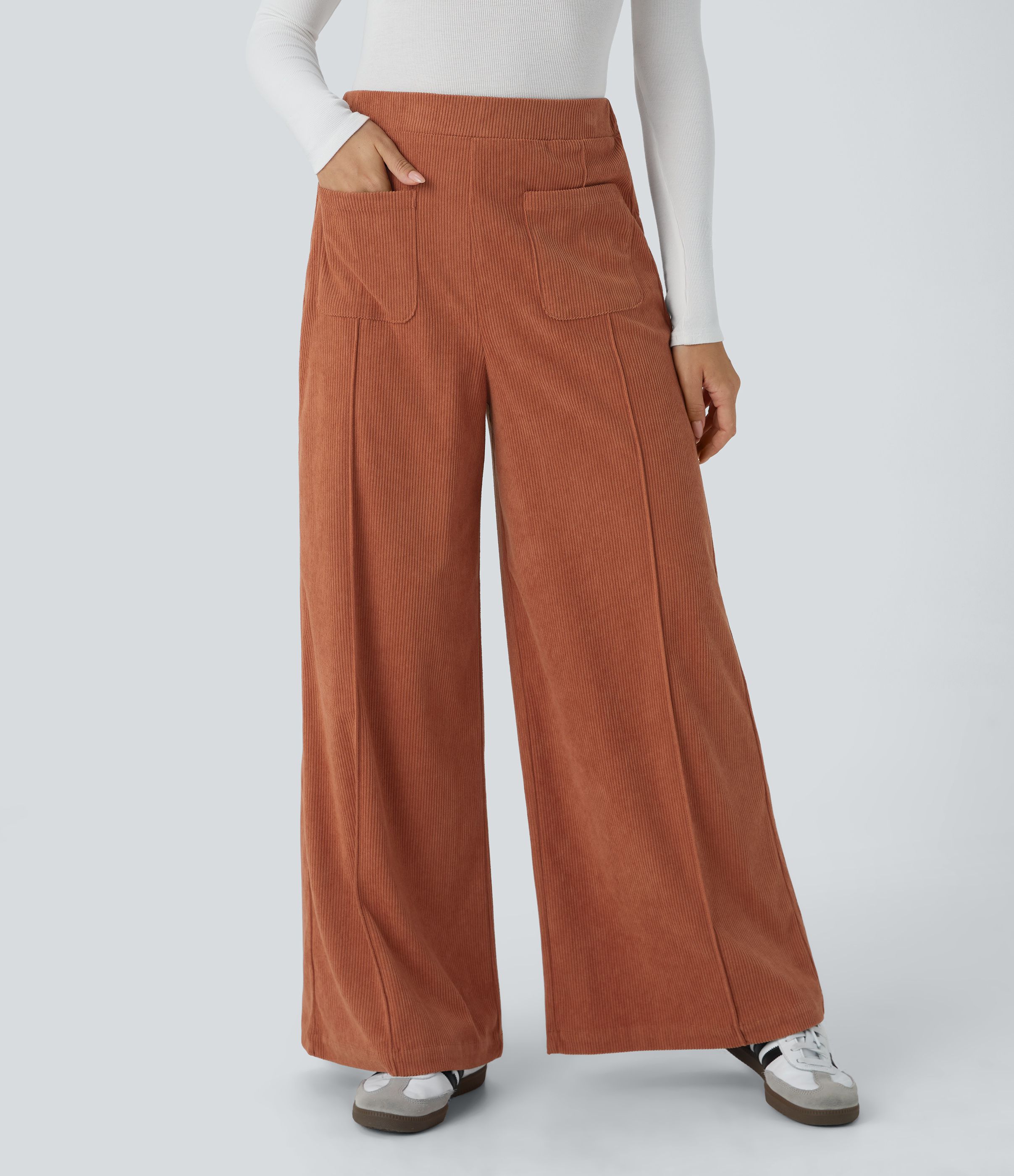 High Waist Front Side Pocket Wide Leg Corduroy Casual Pants