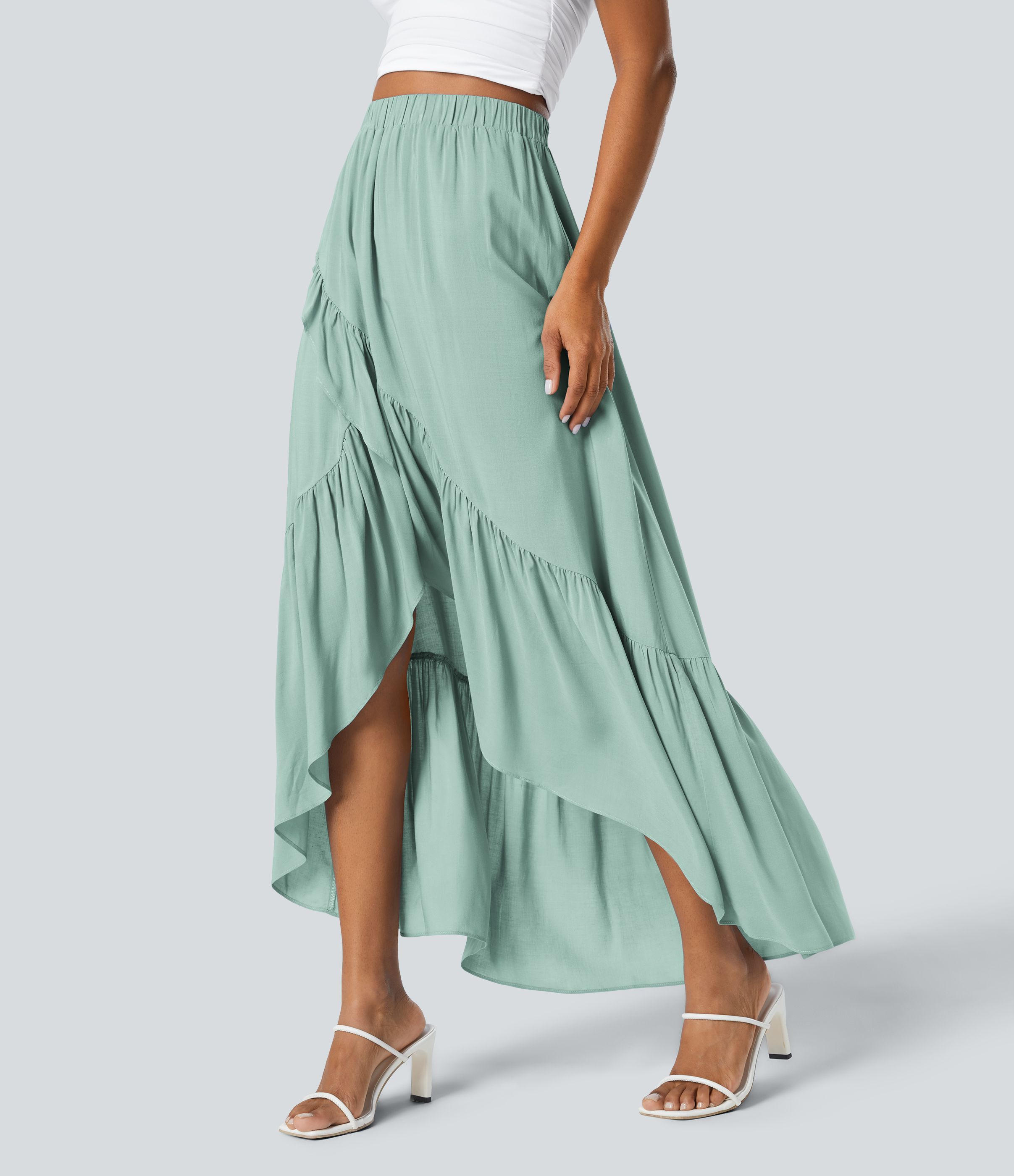 High Waist Pleated High-Low Frill Hem Loose Maxi Resort Skirt