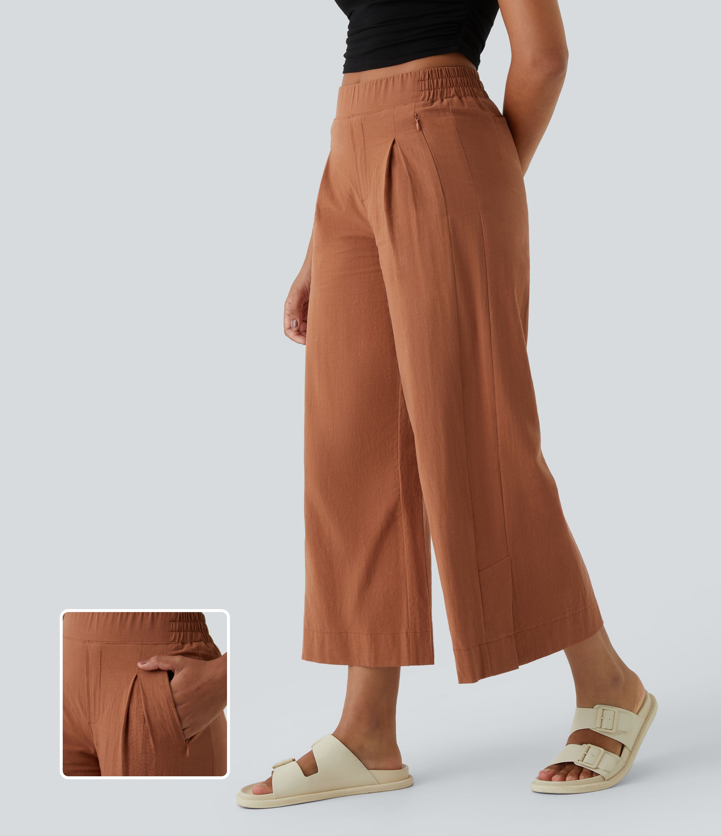 High Waist Pleated Multi-pocket Split Hem Wide Leg Palazzo Capri Casual Linen-style Pants