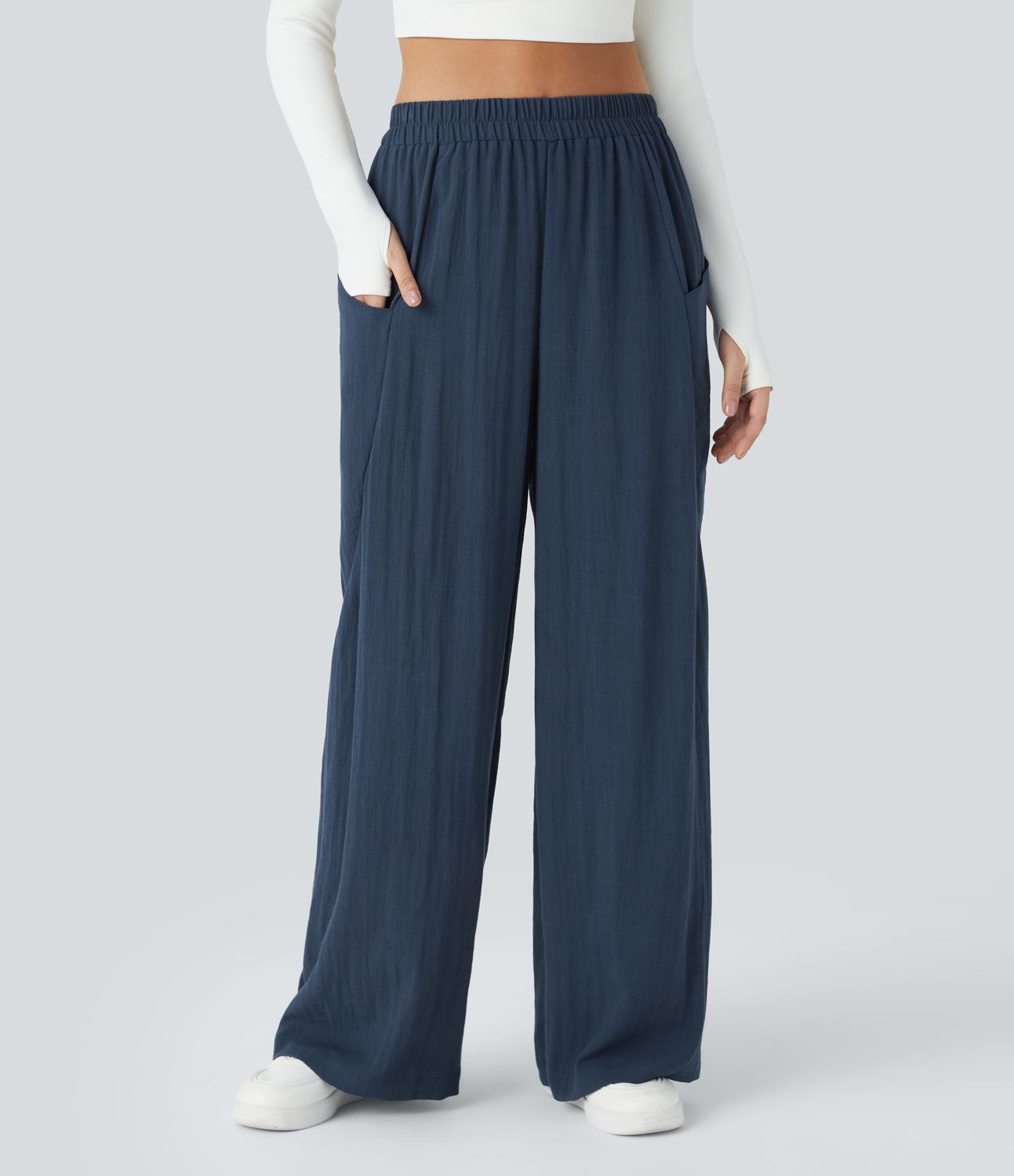 High Waist Side Pocket Wide Leg Casual Linen-Style Pants