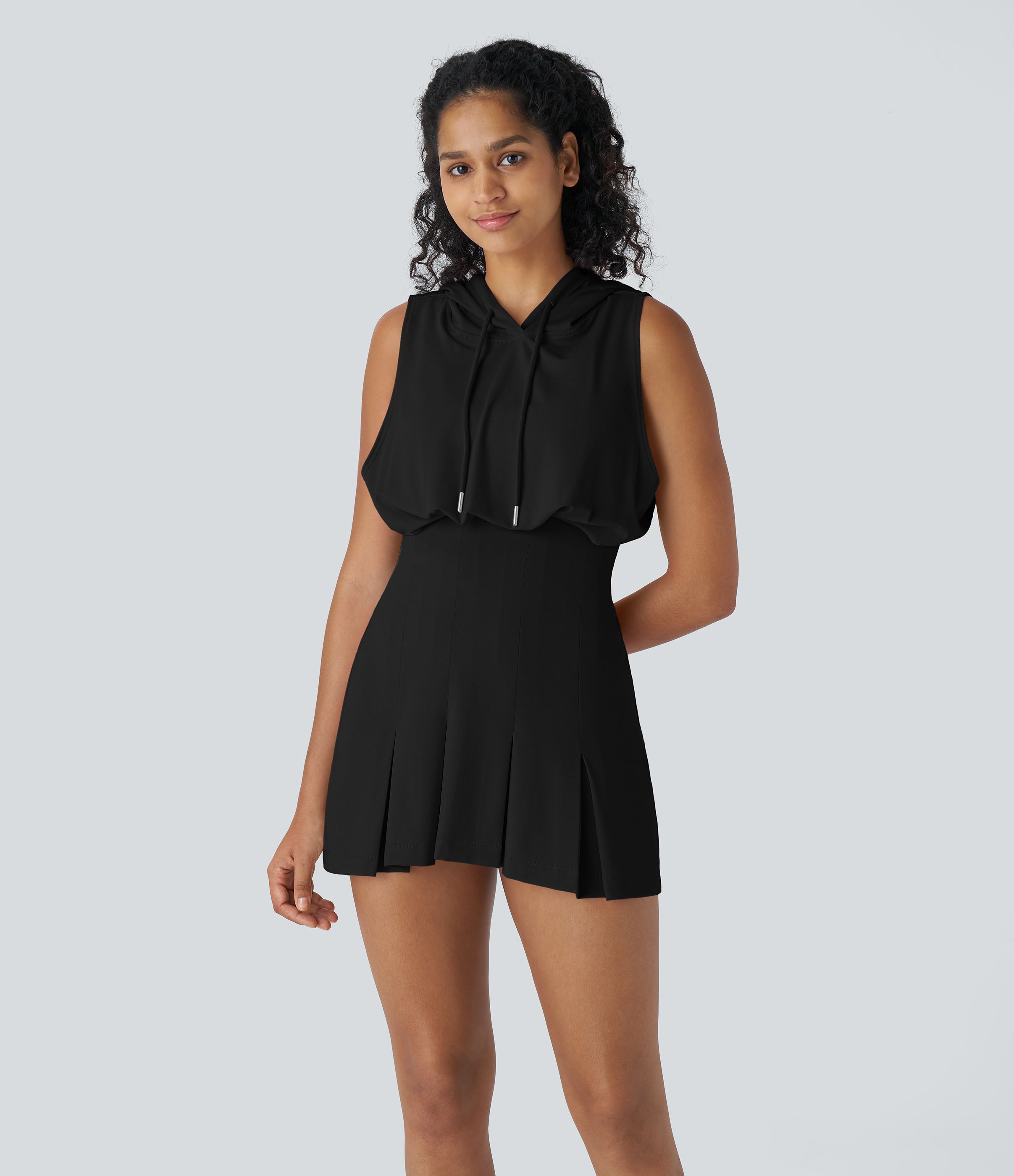 Hooded Drawstring Sleeveless Pleated Mini Casual Dress
