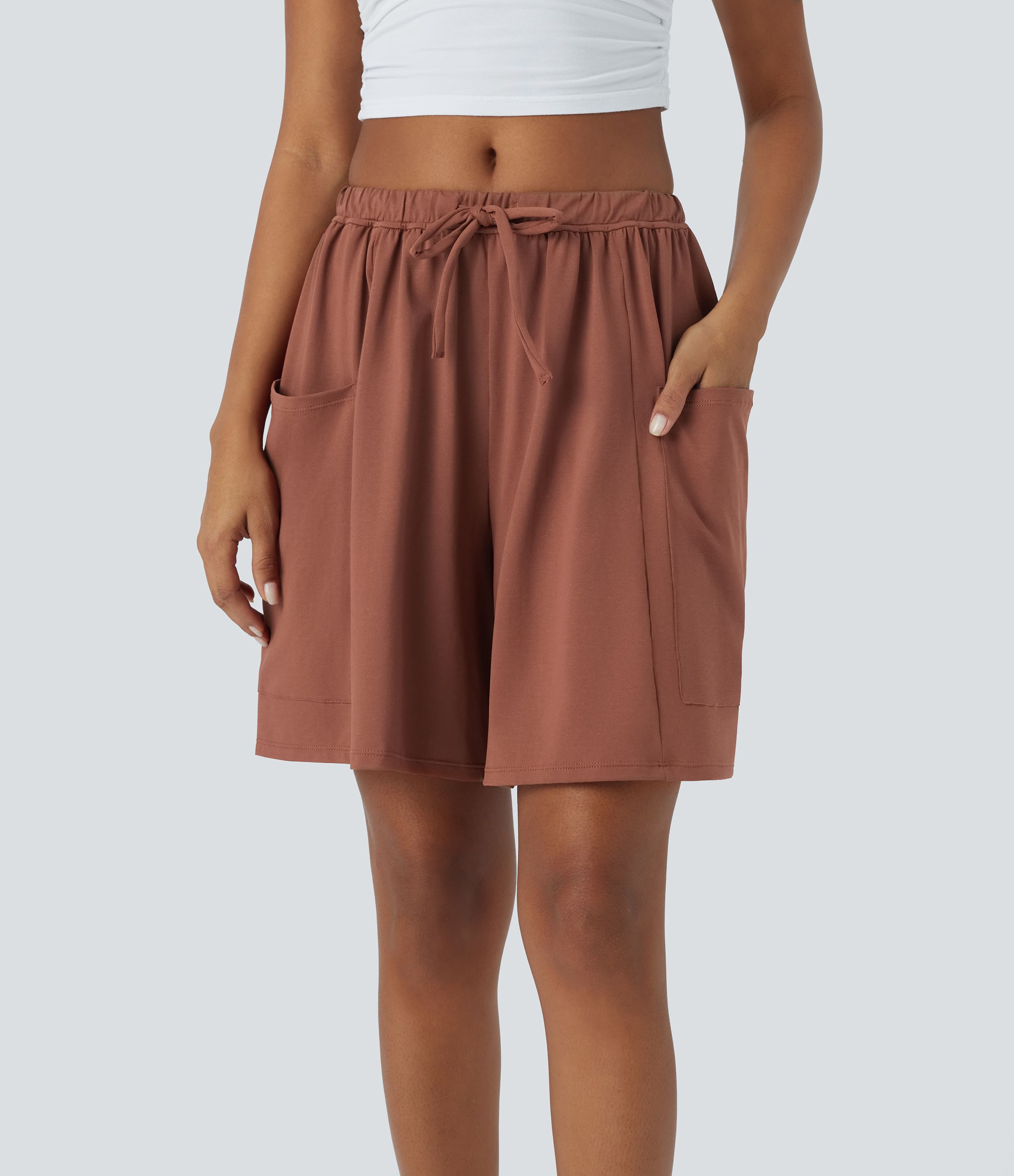 Mid-rise elastic waistband with drawstring, side pockets, palazzo style, relaxed wide-leg casual shorts