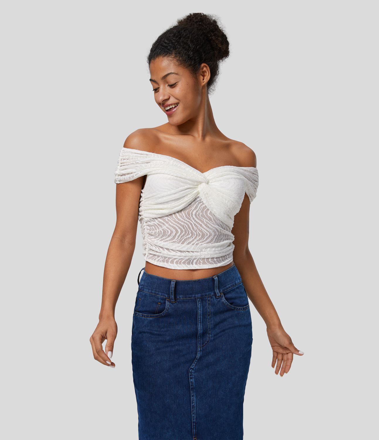 Shoulderless work top with twisted, crossed back and ruffled edge.