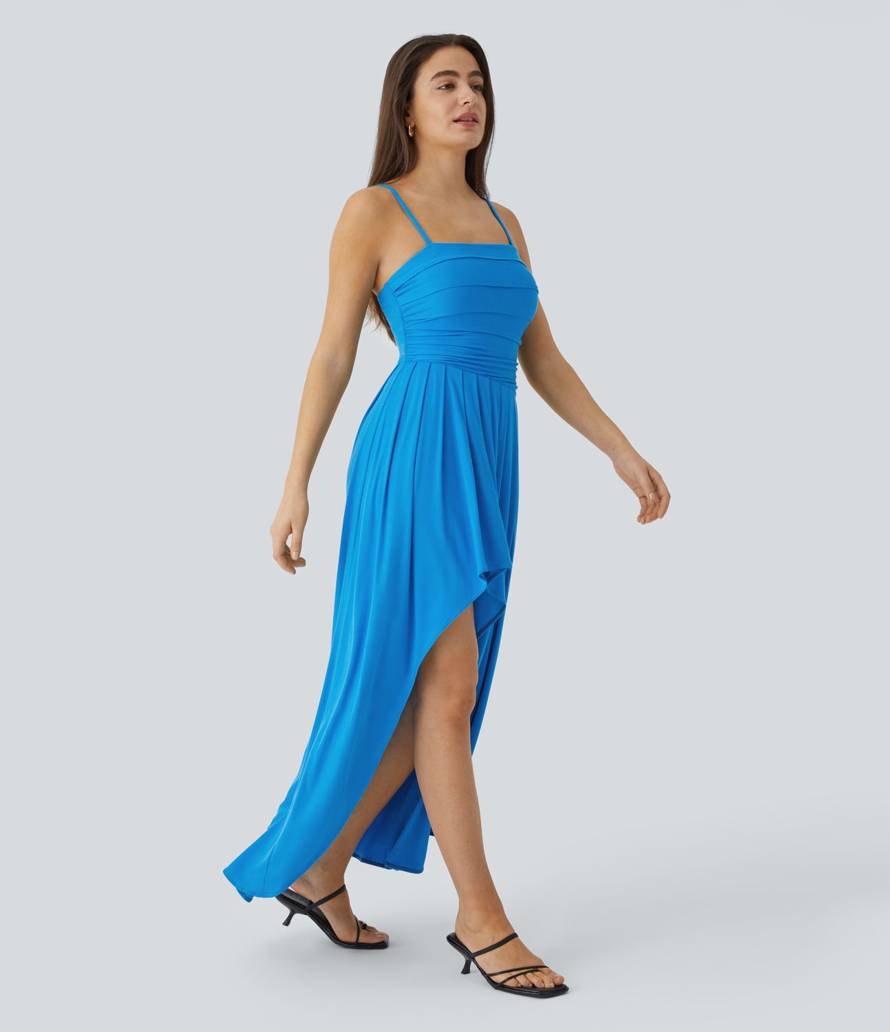 Adjustable strap with rib knit Asymmetrical hem with fold Loose maxi length party slip dress