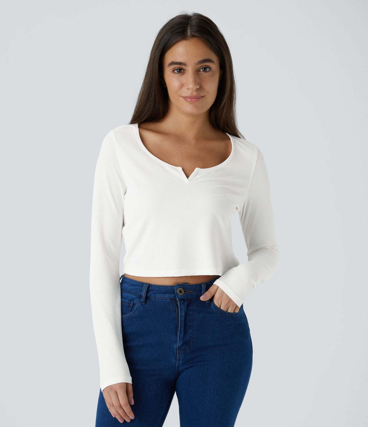 Rib Knit Notched Long Sleeve Cropped Casual Top