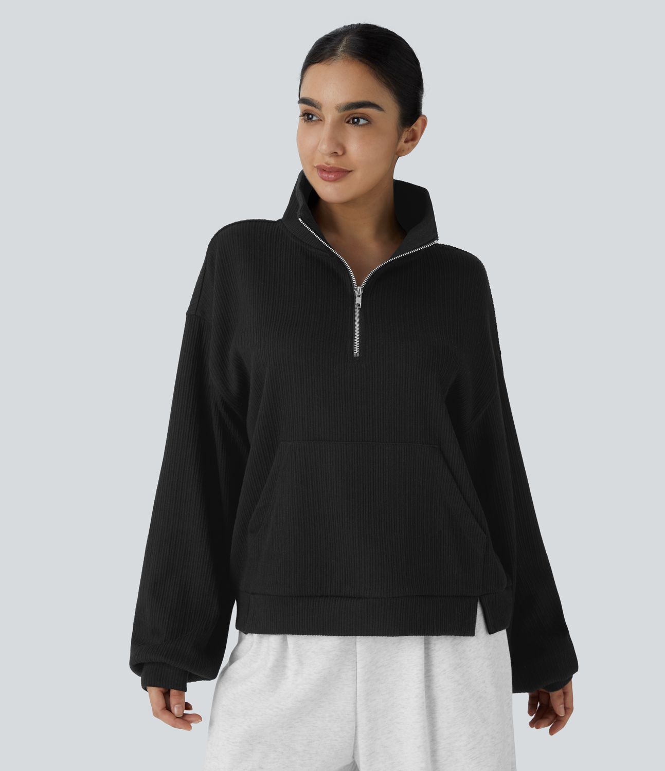 Rib knit stand-up collar half zip long sleeve kangaroo pocket split casual sweatshirt