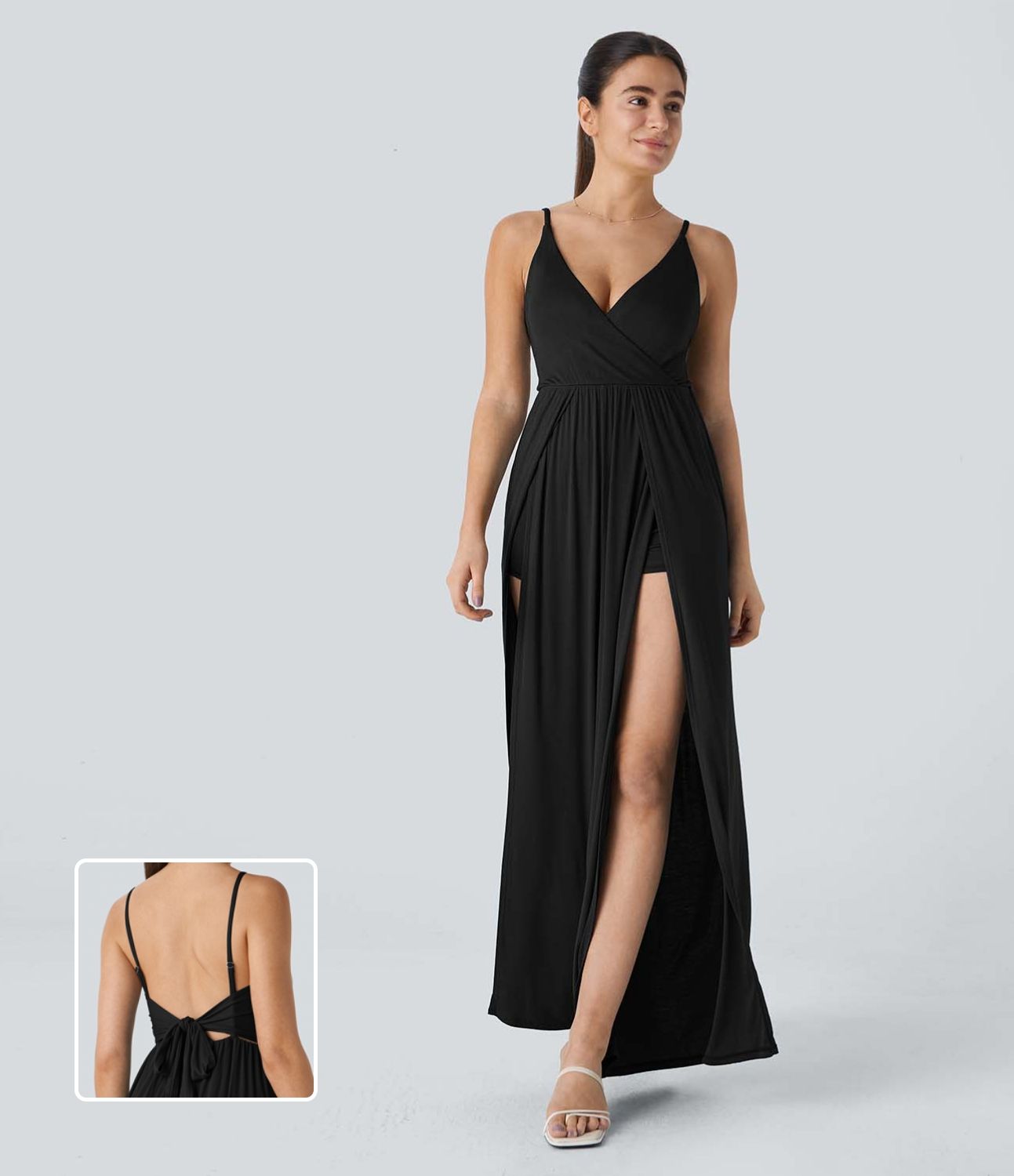 Ribbed knit V-neck adjustable strap backless tie-back split 2-in-1 resort jumpsuit
