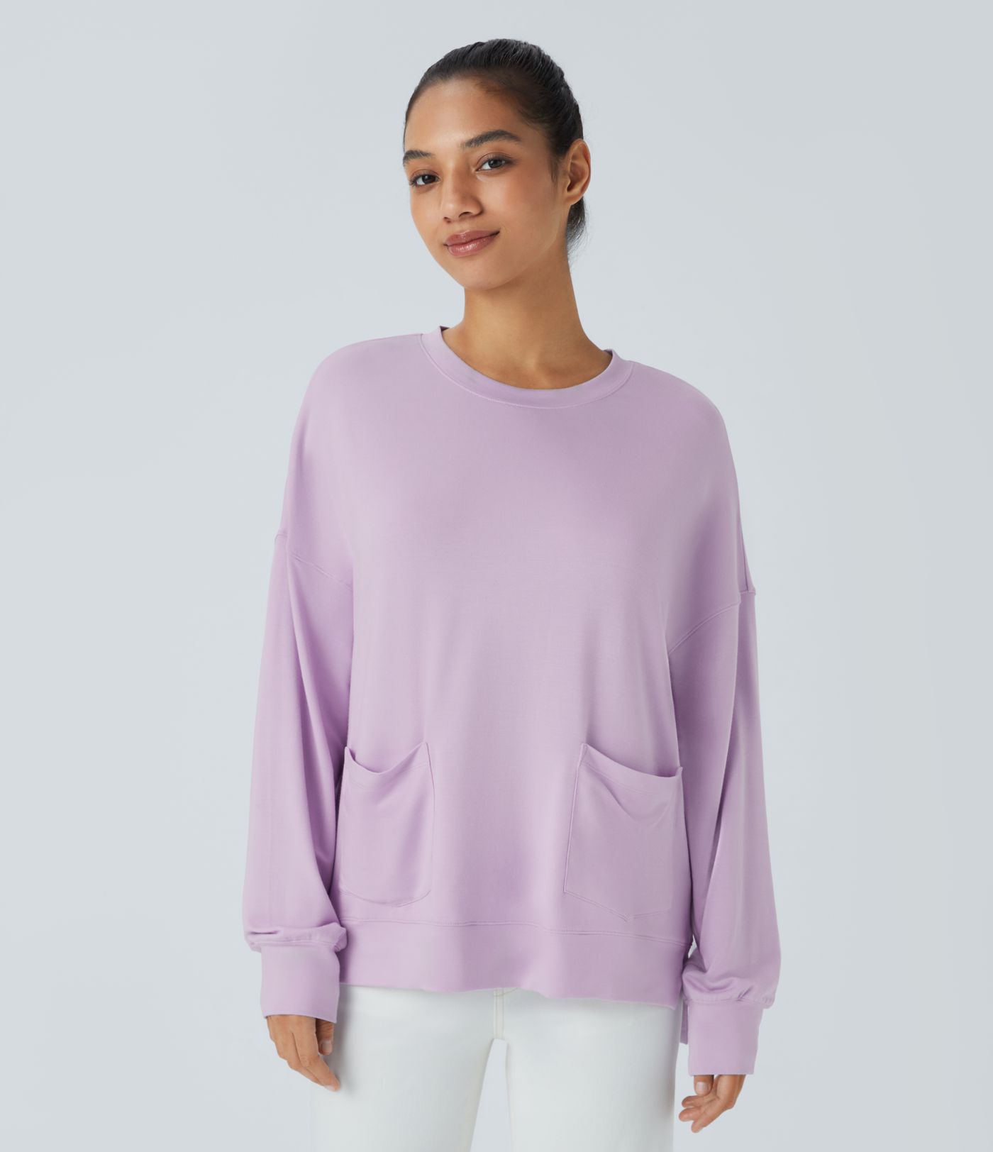 Round Neck Drop Long Sleeve Front Side Pocket Split High Low Oversized Casual Sweatshirt