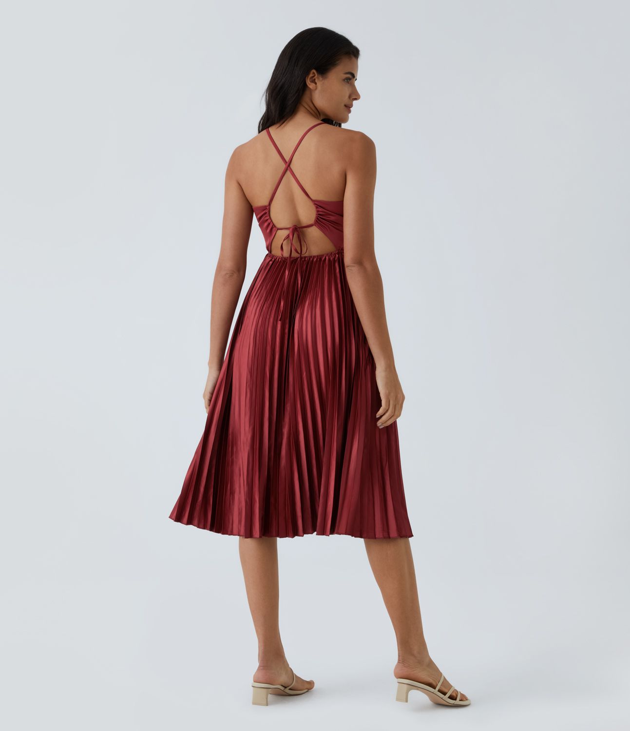 V-Neck Backless Crisscross Lace-Up Pleated Midi Party Dress
